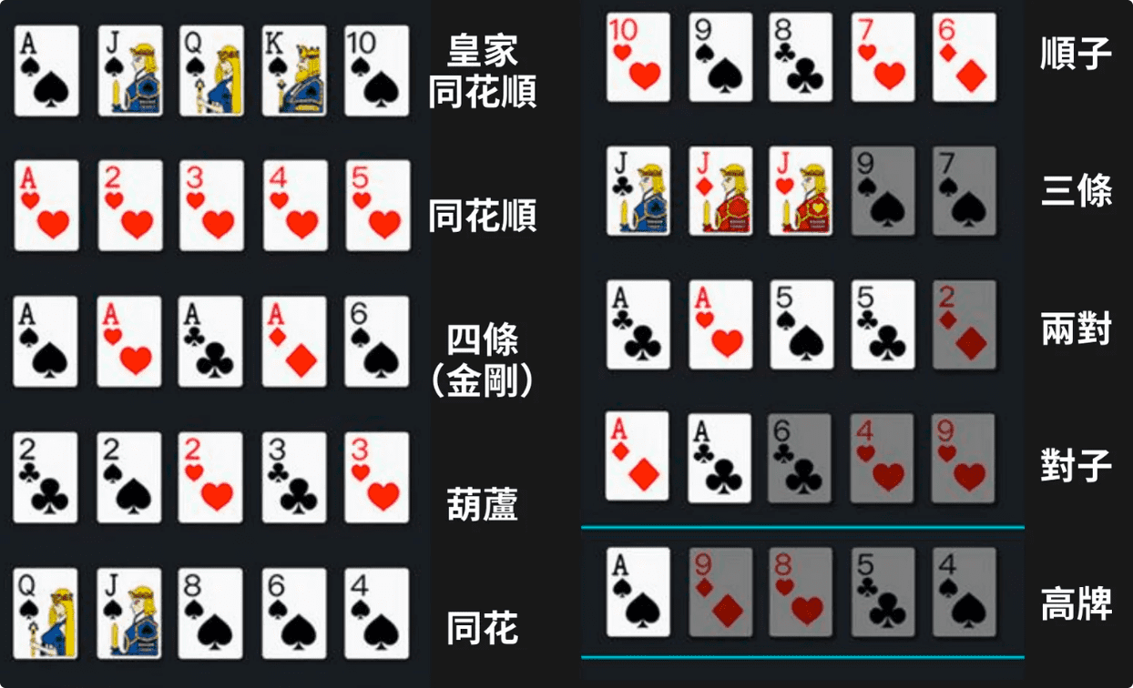 社區卡(Community Cards):這些是正面朝上的卡,可以使用某一手牌的所有參與者。翻牌遊戲,如德州德州撲克和奧馬哈德州撲克,有五張公共牌。